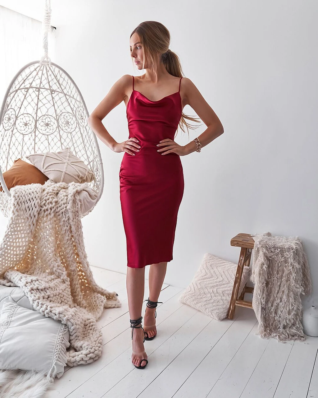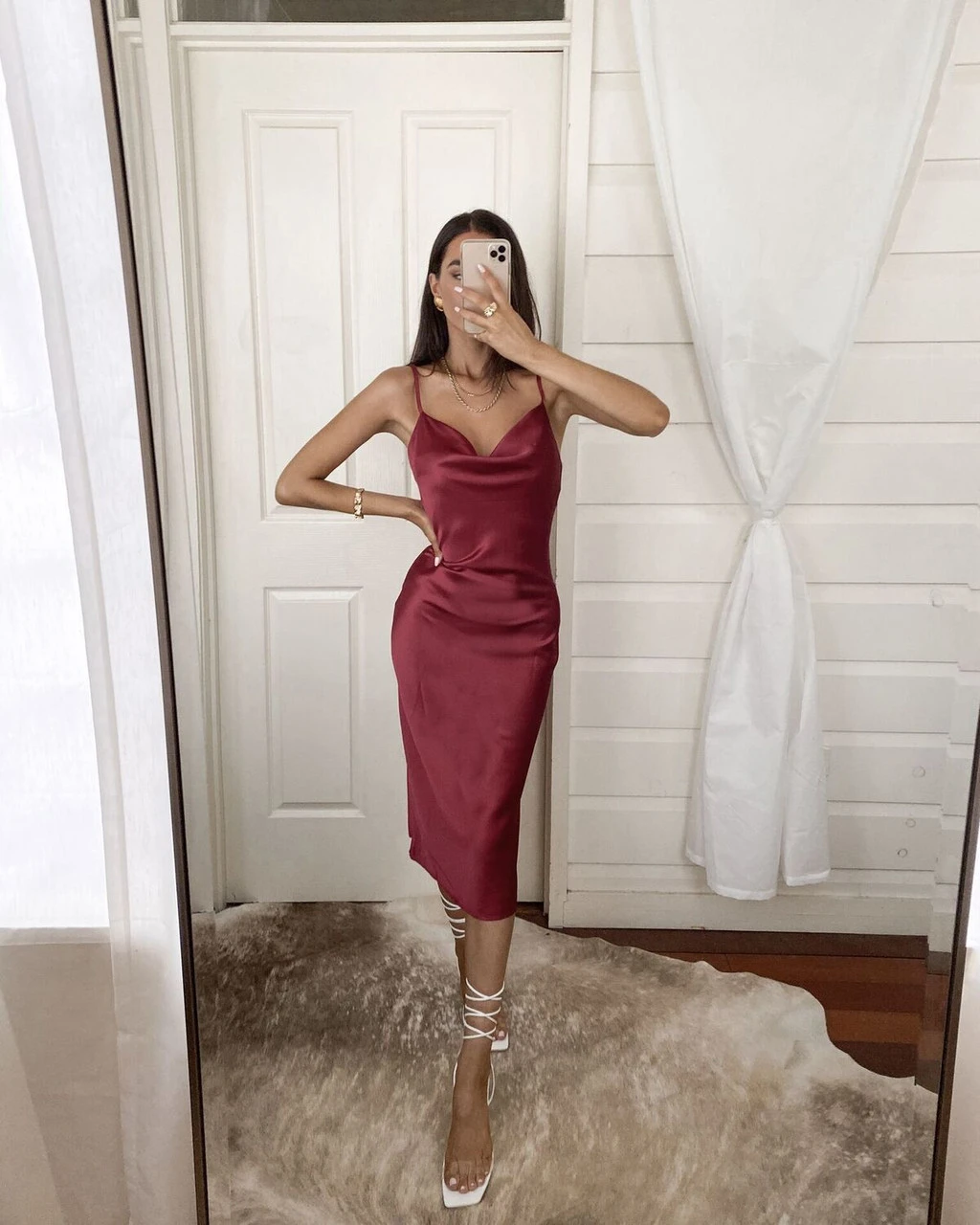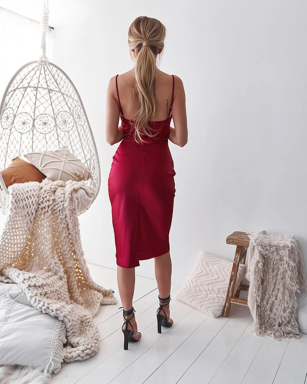 The Aspen Midi Dress in Deep Red Satin is the perfect style for an upscale event, be it worn as a wedding guest dress, cocktail party dress or social occasion.