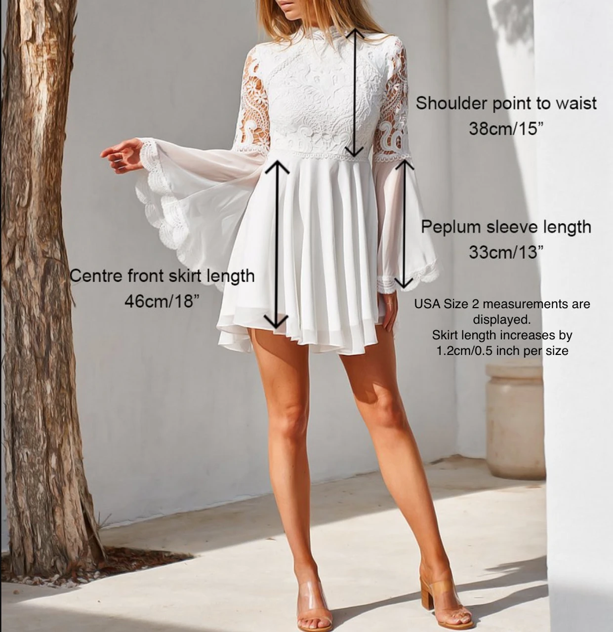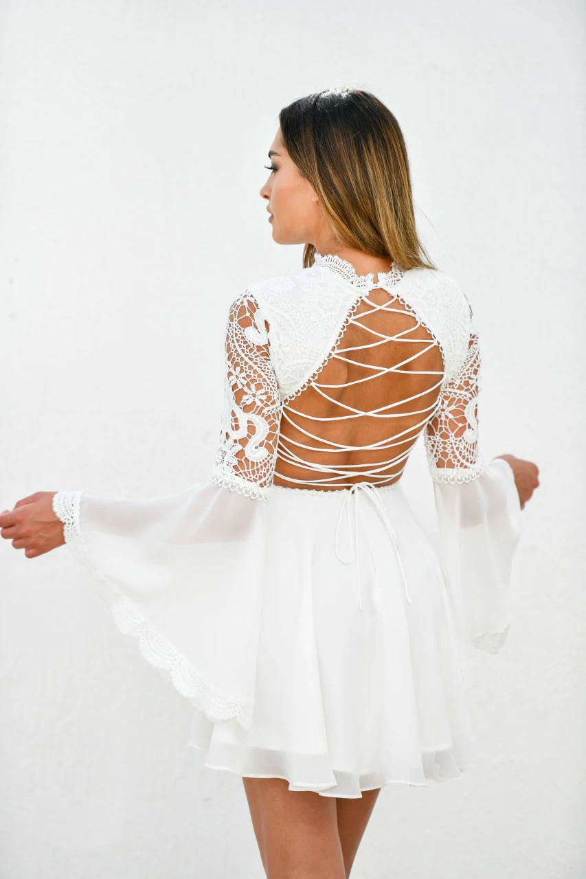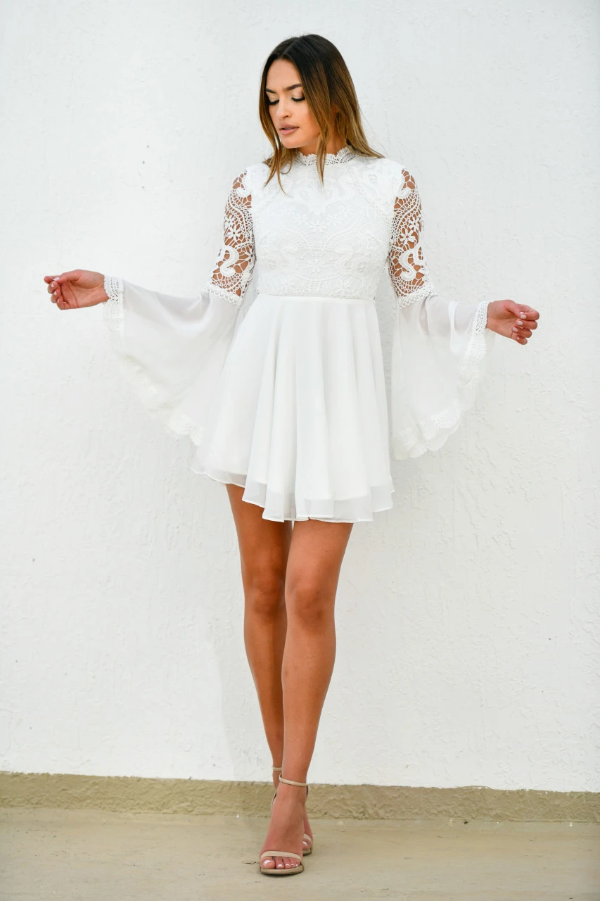 The Paige Dress in White is a stunning mini dress with long sleeves with a boho lace detail that is to die for!