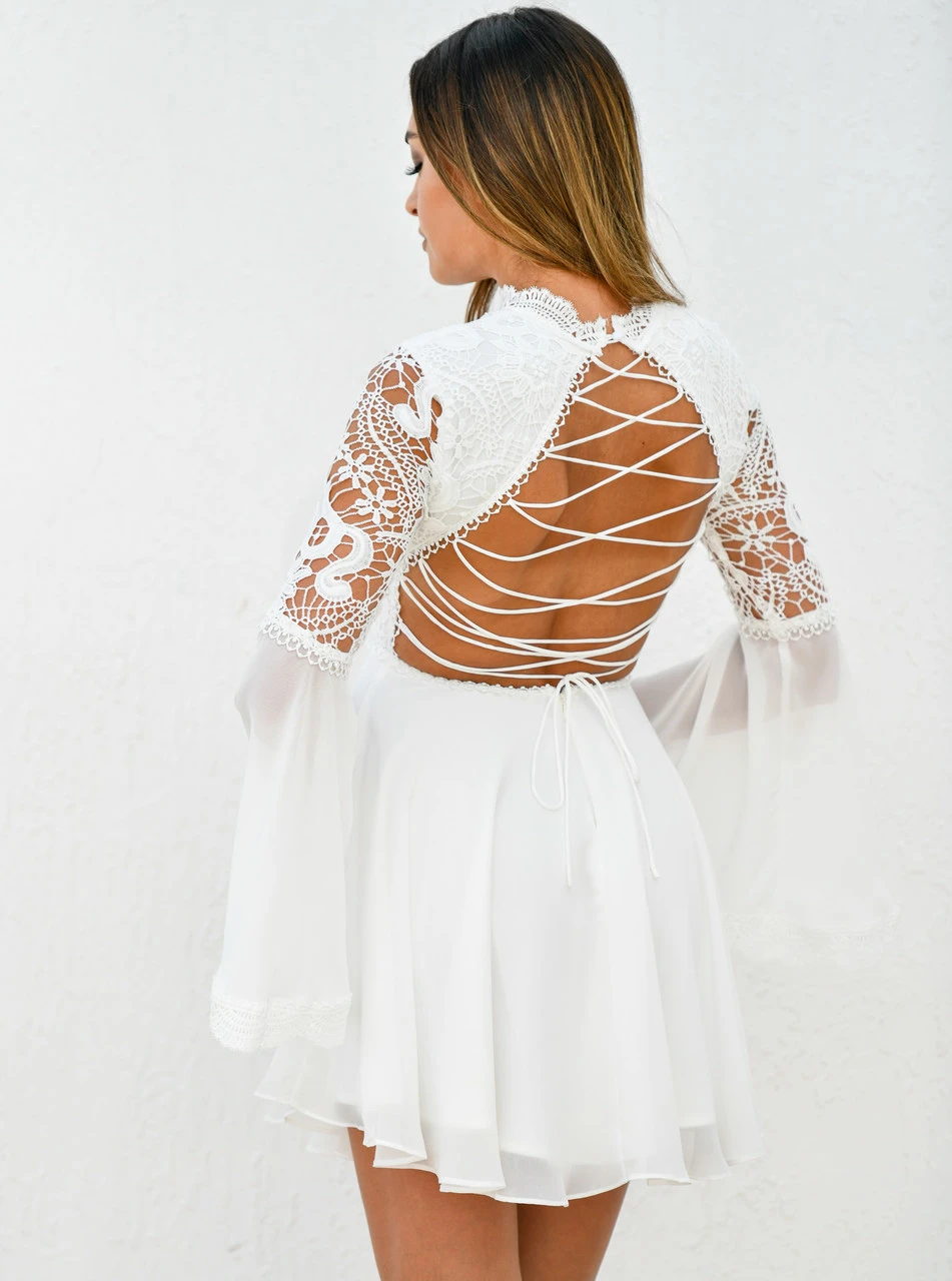 - Sexy open back with lace up detail, complimented with a mini chiffon skater skirt