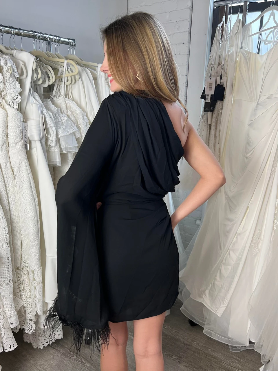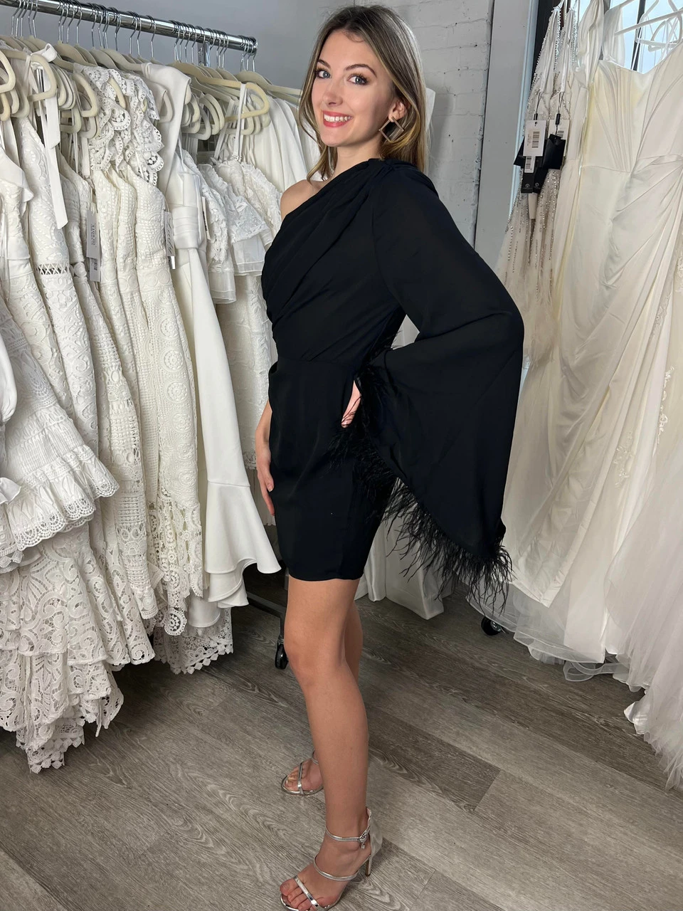 Be the best dressed at your next event in the Cleo One Sleeve Mini Dress! This mini displays ruching throughout the dress to display your beautiful curves! The sheer long sleeve adds to this chic and flirty look!