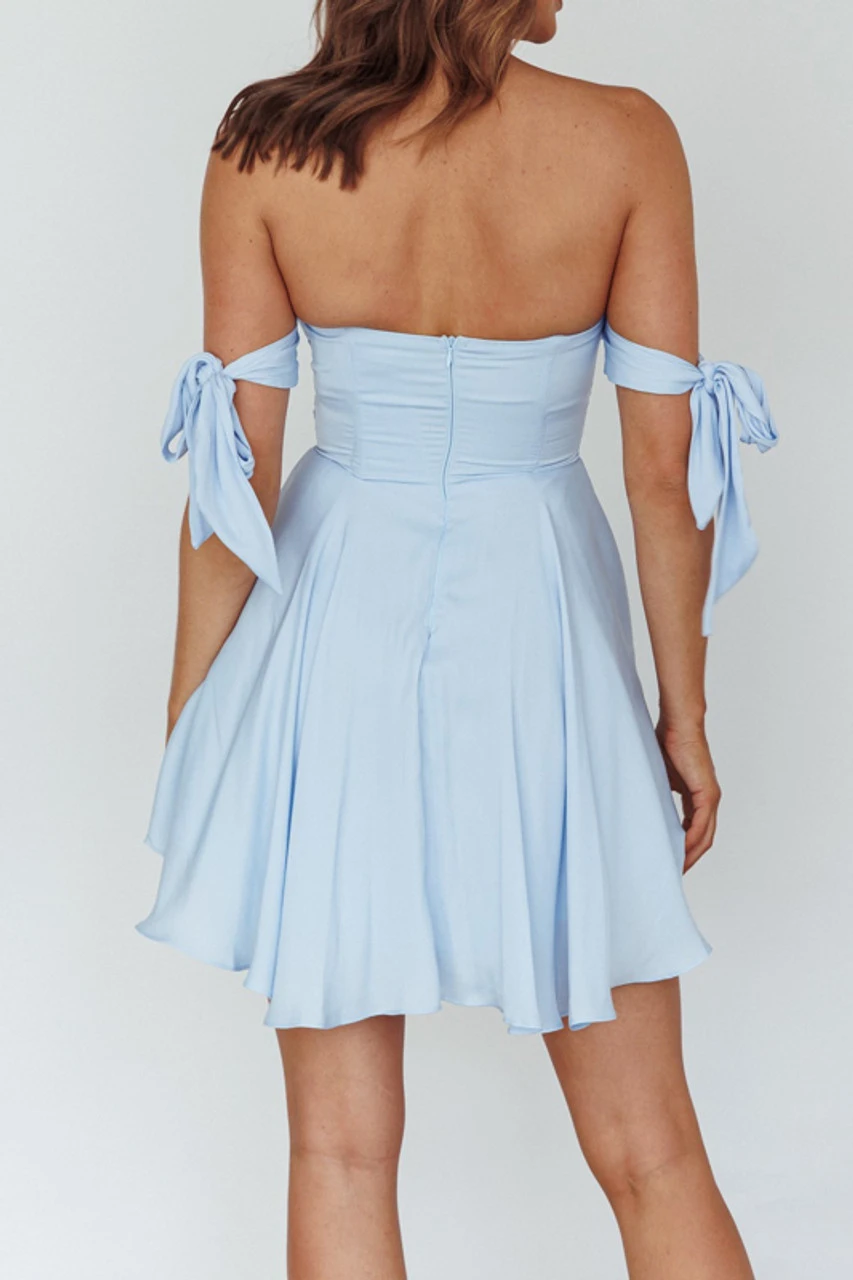 The party seems to follow the Sophie Mini Dress! A sleek satin off the shoulder draped wrap sweetheart neckline with a fit and flare skirt! Features a tied arm sleeve and open back with invisible zipper.