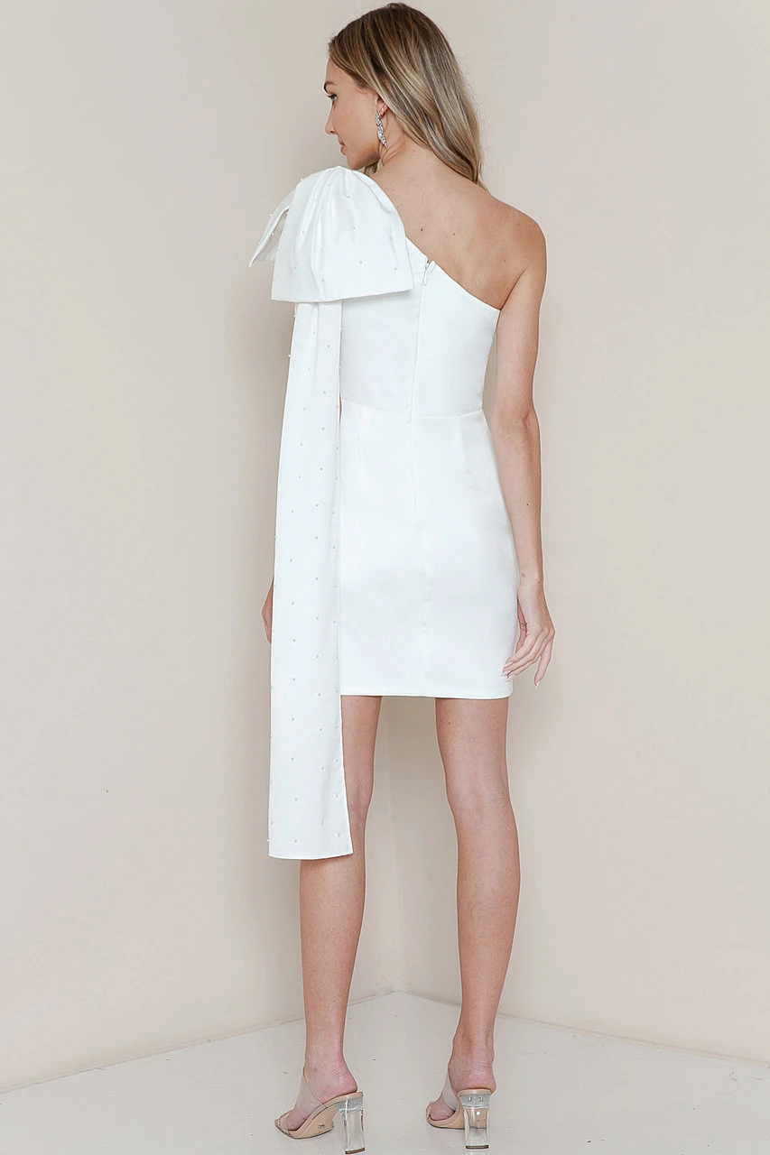 The Veronica One Shoulder Mini Dress is the perfect show-stopping number for every bridal occasion. This mini silhouette is features a wrapped front and dramatic one-shoulder neckline with a shoulder bow and with stunning droplets of beautiful pearl detail.